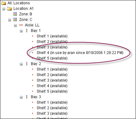 When a shelf is open and in use, you'll see which user has that shelf open on the tree diagram. Only one user at a time can receive into an open shelf.