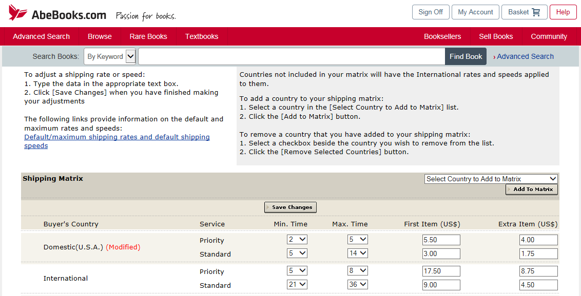 However, Monsoon Marketplace does not have access to this online information when listing items or downloading orders. All uploaded inventory is subject to your settings on the AbeBooks shipping matrix.