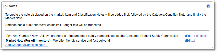 In the Notes section of your Amazon Markets settings, you can define a category and condition combination then add a note that automatically uploads to those listings. You can also edit the default market note that uploads to all listings.