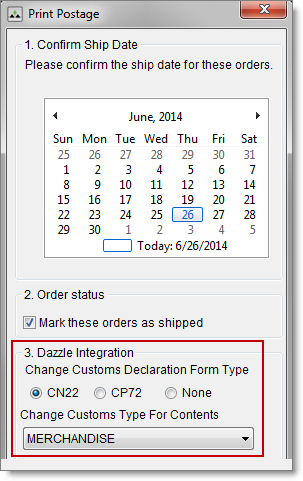 - For International orders, Monsoon Marketplace automatically selects the default customs form you set up earlier. You can click a different customs form type under DAZzle Integration or click None to print the default shipping label without printing a customs form.