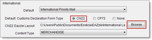 - Click Browse next to CN22 DAZzle Layout to choose the CN 22 layout you previously set up in DAZzle, and then double-click International Label - Small 6x4.lyt.