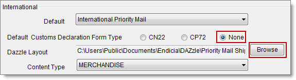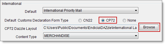 - Next to Default Customs Declaration Form Type, click the option you want as your default when you print postage for international orders—CN22, CP72, or None.