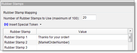 - Under Rubber Stamps, click in Value then click Insert Special Token and select a value to map from Monsoon Marketplace to a Rubber Stamp inserted into any of your DAZzle labels. Commonly used values are Market Order Number and Order Date.You can even type a message as a Rubber Stamp value such as "Thanks for your order!" to display on all of your labels.