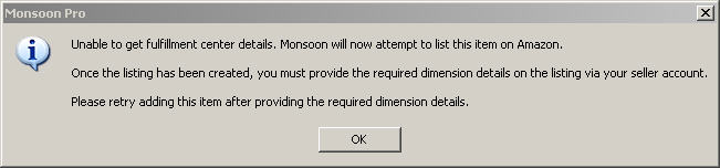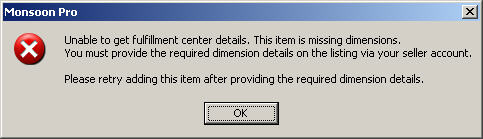 Problem: Amazon has indicated that this item is missing dimension data in their catalog. These messages may indicate either missing item or package dimensions. Amazon requires item dimensions for FBA items as they charge for storage based on item volume.