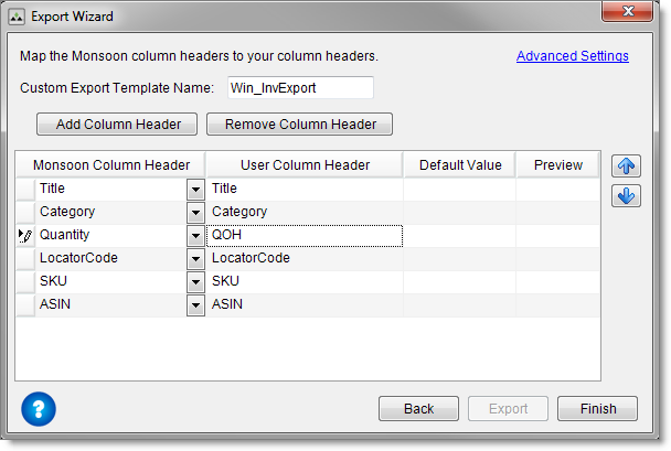 You can create a custom template to export a select group of inventory columns. If you use a data exchange, you can create a custom template to map Monsoon Marketplace column headers to column headers in your external source.