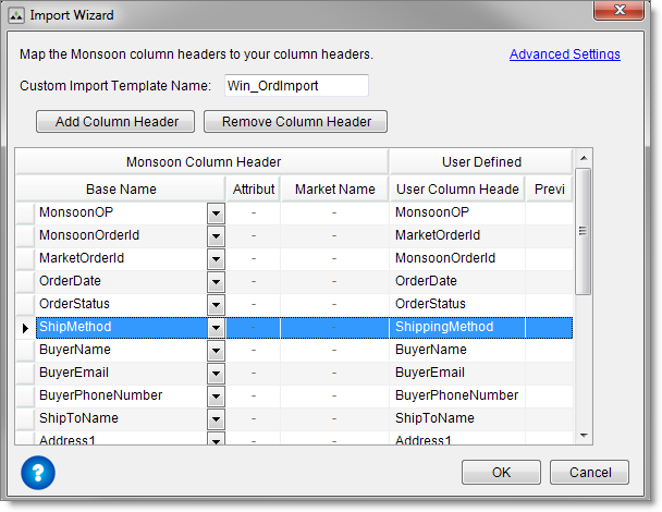 If you use a data exchange, you can map Monsoon Marketplace column headers to column headers in your external source. In User Column Header, type the exact name of the column that will be imported.