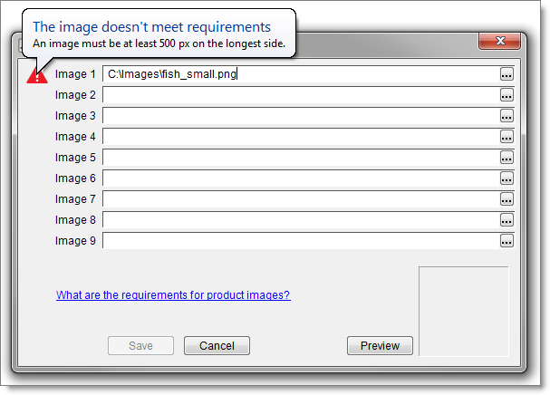Supported image file formats are JPG, PNG, GIF, and TIF. Monsoon offers free upload and hosting for images with a minimum size of 500 pixels on the longest side and a maximum size of 1024 KB. If an image doesn't meet size requirements, you'll be alerted by an error icon. (Hover over the icon to see the size requirement error message.) Before you can save, you will need to change any images that receive the error.