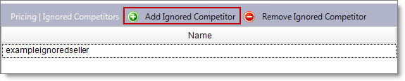 - Click Add Ignored Competitor, then click New Ignored Competitor and type the Amazon nickname of the seller you want to ignore when pricing. If you've checked the Get prices from eBay check box on the Settings tab under eBay General, type the seller's eBay name.