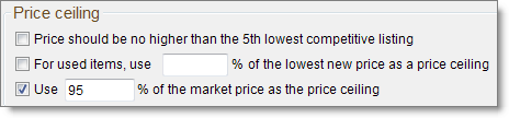 A dynamic price ceiling applies at the time an item prices. Depending on the condition of an item, you can use a price ceiling that's no higher than the 5th lowest competitive listing, is a percentage of the lowest new price, or is a percentage of the market price.