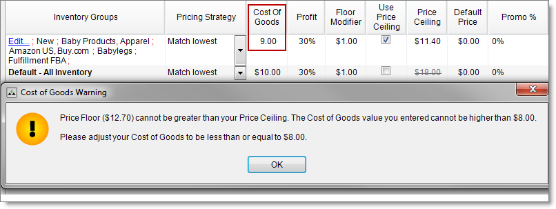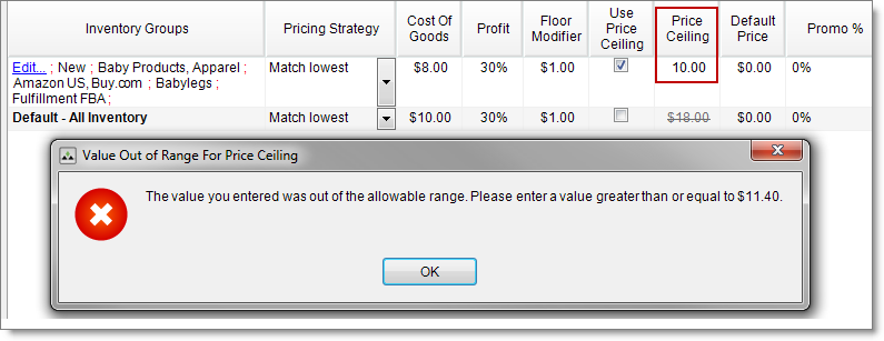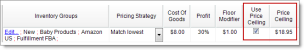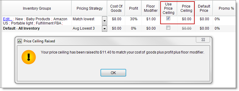 The price ceiling you set up in a custom pricing strategy is a dynamic value. A price ceiling set up on the Settings tab under Inventory Pricing (group level) or on the My Inventory tab (item level) is a fixed monetary amount.