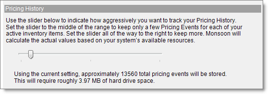 A pricing event is the series of steps and market data used by Monsoon to price an item. By moving the Pricing History slider on the Settings tab under Pricing General, you can set how many of these pricing events are stored on your hard drive.