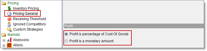 Caution Profit mode is a global setting. When you change your profit mode, all inventory with an applied profit value—applied either at the inventory group or item level—switches modes and reprices accordingly. For example, 25% would change to $25.00 if you were to switch your profit mode from percentage to monetary.