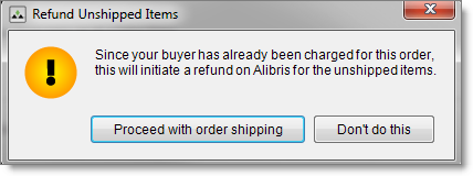 An order in Partial Shipped status may require you to submit a refund at the time you ship. For example, if you decrease the quantity of an Alibris, AbeBooks, eBay, or Half.com order you're prompted to submit a refund at the time you ship. Shipping partial Amazon and Rakuten.com Shopping orders works differently. When you ship a partial Rakuten.com Shopping order, the market automatically cancels unfulfilled items and only charges buyers for the items that actually ship. When you ship a partially fulfilled Amazon order, the market charges the buyer the compete order amount so you need to submit separate refund transaction for any unfulfilled items.