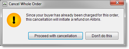 Alibris and AbeBooks are markets that charge buyers at the time they place an order. When you cancel an order from one of these markets, you'll be prompted to immediately refund the order or order item.