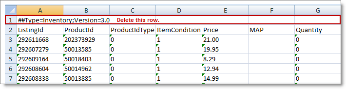 - In the opened file, delete any row that does not contain your column headers or a Listing ID.