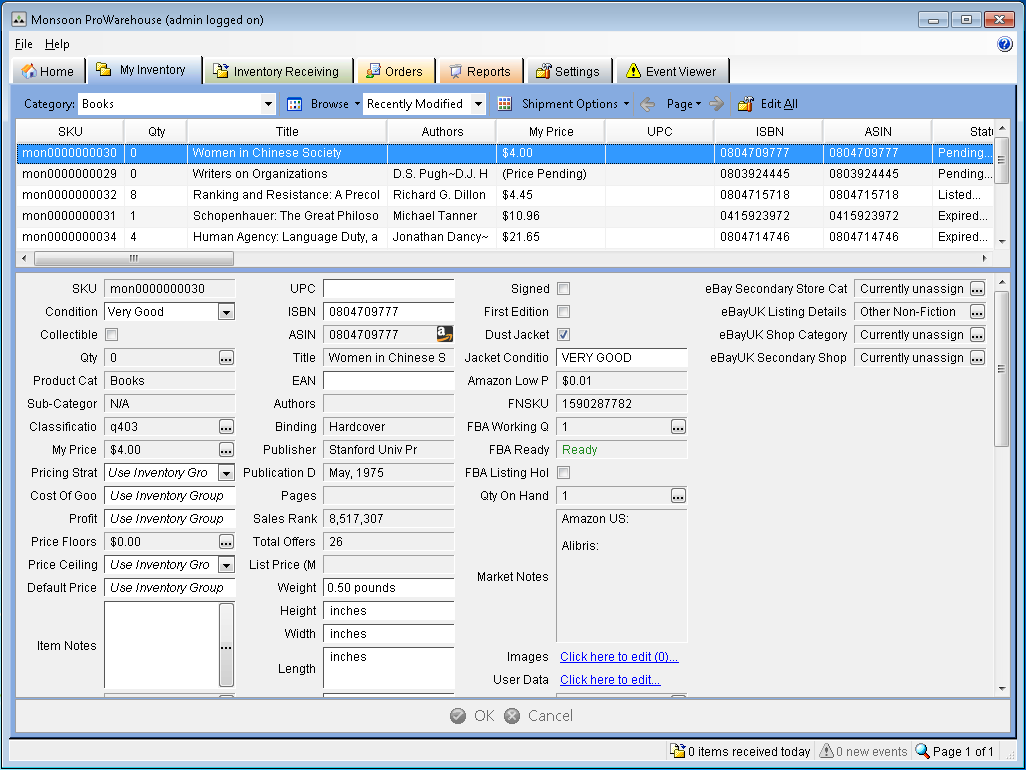 You can use the tools and fields on the My Inventory tab in Monsoon Marketplace to view and manage your current inventory. For example, you can:
