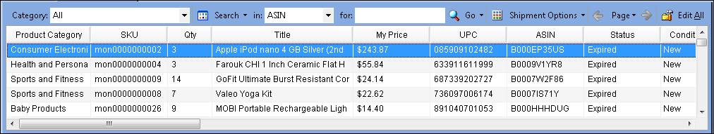 You can browse or search within categories using the Category drop-down list. This list is populated with the categories that you selected as part of setting up markets on the Settings tab. Browsing or searching within a specific category will speed up your search, especially if you have a very large inventory.