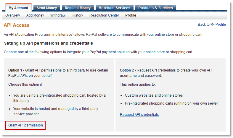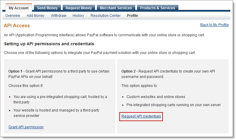 - Under Option 2, click Request API Credentials.