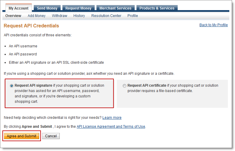 - Select Request API Signature, and then click Agree and Submit.