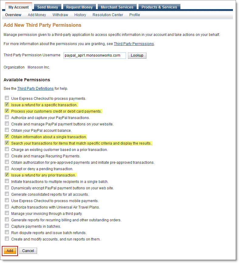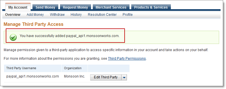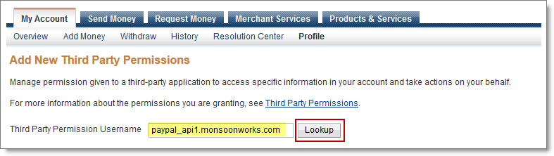- In Third Party Permission Username, enter paypal_api1.monsoonworks.com then click Lookup.