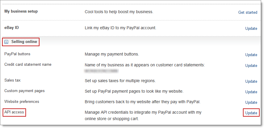 - Under Selling online, next to API access, click Update.