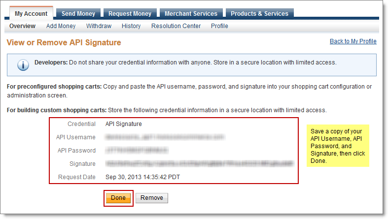 - In the View or Remove API Signature window, save a copy of your API credential information, and then click Done.