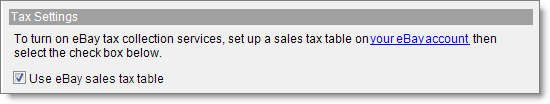 To collect sales tax on eBay US, you first need to set up a tax table on your eBay seller account to specify a sales tax rate for each US state in which you're required to charge sales tax. After you set up the tax table, select the Use eBay sales tax table check box in Monsoon Marketplace.