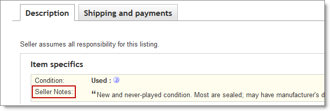 Item and classification notes also display in Seller Notes below Condition on a listing's Description tab: