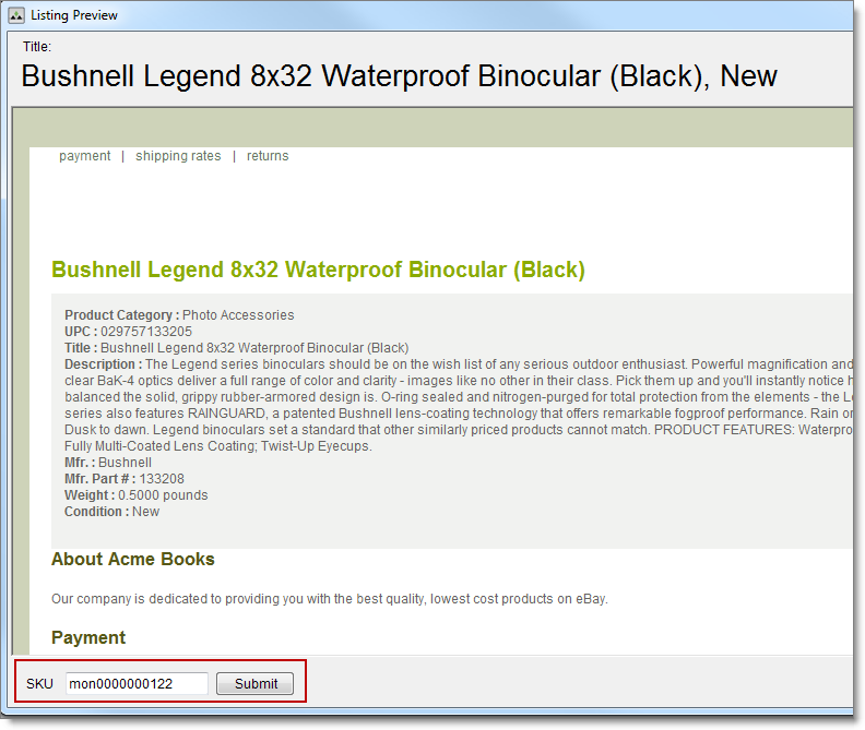 - To preview a specific item, type the SKU in the SKU box, and then click Submit.