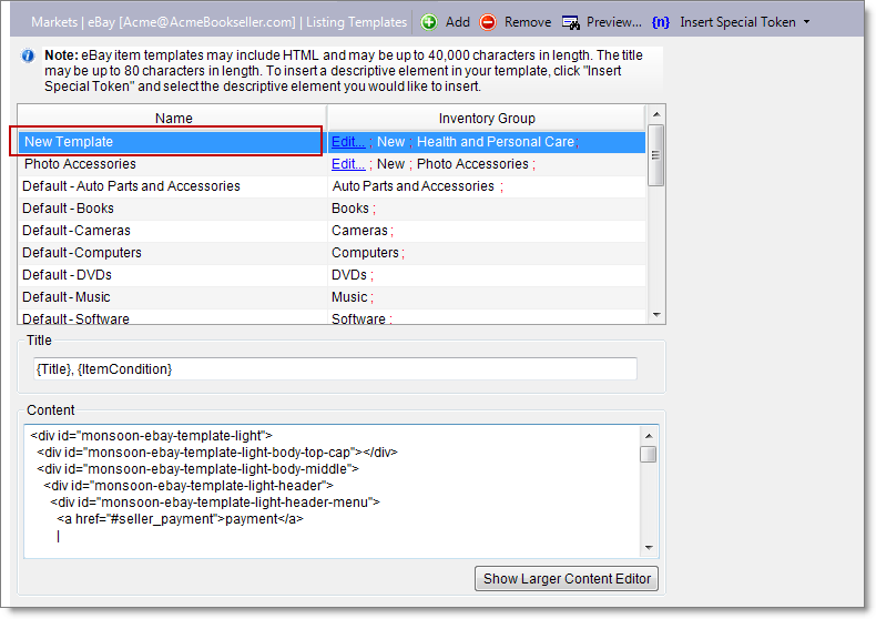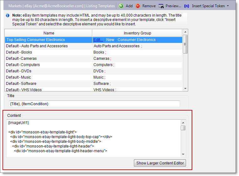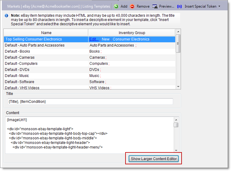 - On the Settings tab, under eBay, click Listing Templates. and then click Show Larger Content Editor.
